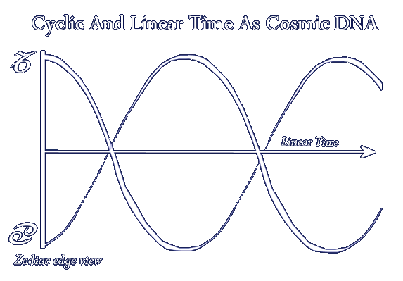 This is where we add the linear view of time to cyclical time. The linear arrow of time proceeds from the left to the right. If we see time spinning around the wheel at the same time that it is going ever forward, left to right, then the combined movements of cyclical time and linear time move together to form a cosmic double helix. This then is the genetic structure of creation.